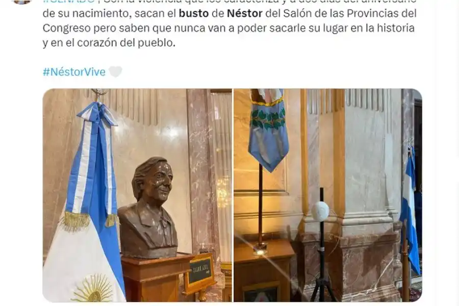La legisladora criticó al gobierno de Javier Milei y apuntó a que "con la violencia que los caracteriza y a dos días del aniversario de su nacimiento, sacan el busto de Néstor". Además, añadió que "saben que nunca van a poder sacarle su lugar en la historia y en el corazón del pueblo". A lo que sumó un hashtag bajo el nombre de #NéstorVive y un emoji de un corazón blanco.