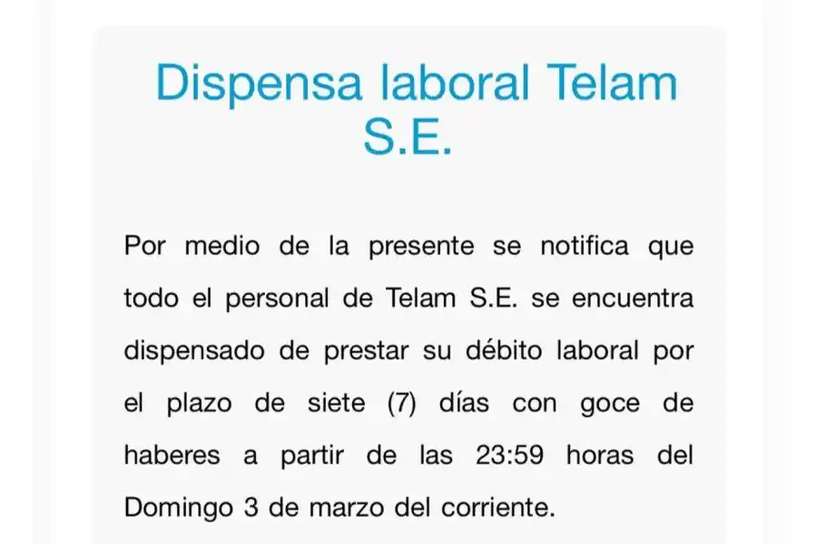 Tras ello, el sitio web fue inhabilitado y el interventor designado, Diego Chaher, envió un comunicado a los trabajadores. “Por medio de la presente se notifica que todo el personal de Télam S.E. se encuentra dispensado de prestar su débito laboral por el plazo de siete (7) días con goce de haberes a partir de las 23:59 horas del domingo 3 de marzo del corriente”, se lee.