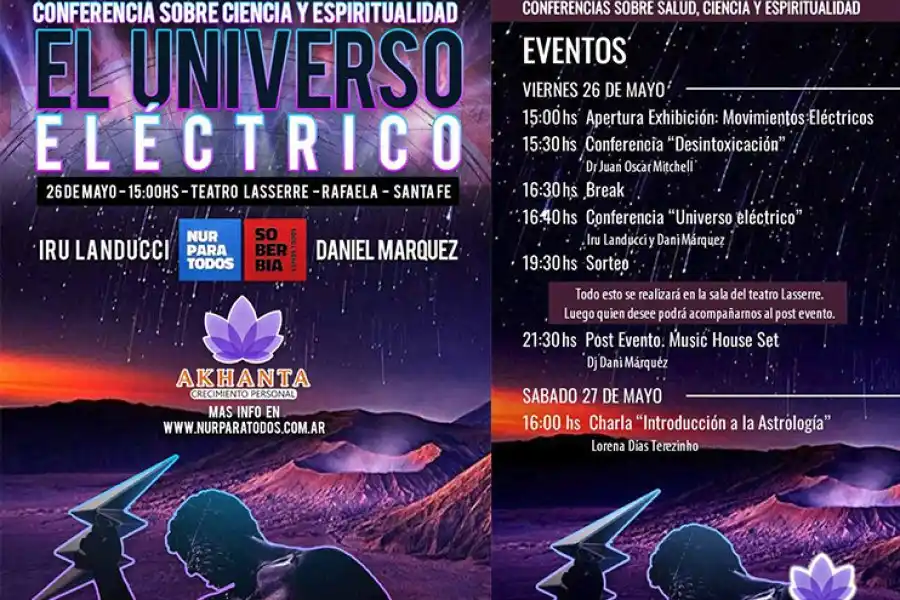En conjunto, brindarán conferencias “sobre el universo eléctrico, que básicamente es lo que toda cultura anterior hablaba sobre el éter, sobre la electricidad que hay en el aire, en la atmósfera, y que lo podemos visualizar en los truenos, cuando hay una tormenta, en los relámpagos”.