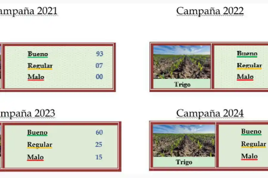 En medio de condiciones ambientales muy agresivas, caracterizadas por mayor cantidad de horas luz, temperaturas máximas elevadas para la época del año y jornadas ventosas de dirección norte, el SEA indicó que el mal estado de los trigos "se acentuó en la zona centro, centro oeste y noroeste del SEA, donde aumentaron los síntomas de déficit hídrico de los sembradíos, como amarillamiento foliar, irregular evolución de las plantas, menor desarrollo en altura de los ejemplares y como consecuencia, cultivares irregulares, no uniformes". La mitad de los lotes en el centro norte santafesinos están buenos, mientras la otra mitad califica entre regulares (31%) a malos (19%).