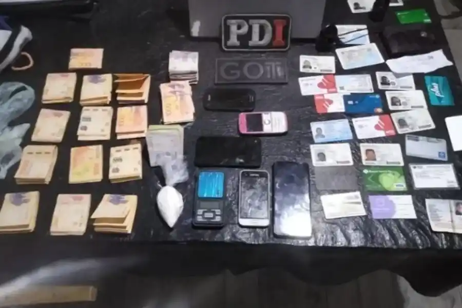 Efectivos de la PDI procedieron a la aprehensión de Fabián N., Diana V., Alejandro C., Florencia C., Gabriel F., y Graciela S. Además secuestraron cocaína por un pesaje total de 2106 gramos, un envoltorio y dos plantines de marihuana, elementos de fraccionamiento, dinero en efectivo por 1.896.260 pesos, 2001 dólares, telefonía celular, tres automóviles, dos balanzas y dos máquinas contadoras de billetes.