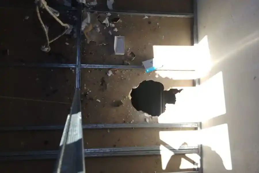 “Después llegaron a la parte superior del local comercial, y con herramientas que habían llevado consigo, realizaron un corte rectangular en el techo de chapa, hicieron tres boquetes en el cielo raso y bajaron con una soga al baño del comercio”.