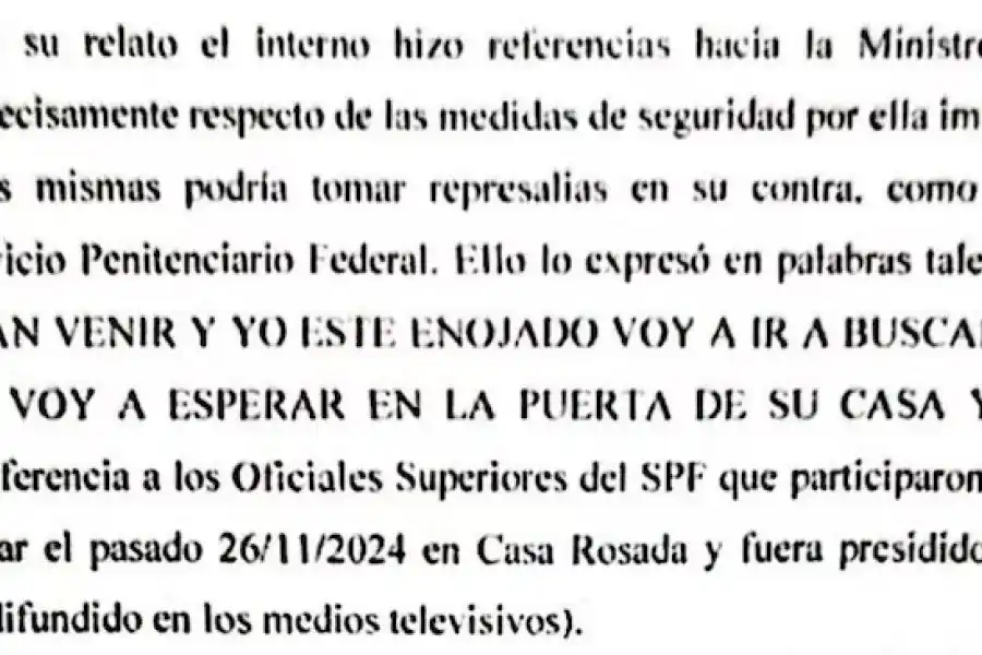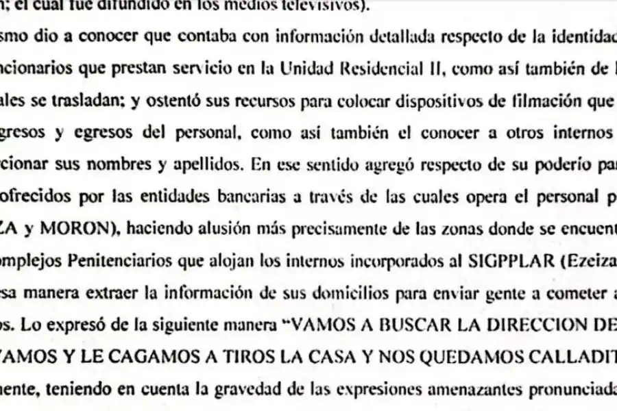 Tras esa frase, Cantero habló sobre la entrega de los sables. Pero continuó. Dijo que tenía “información detallada respecto de la identidad y los domicilios” de los agentes del SPF que trabajan en la cárcel de Marcos Paz y que tenía recursos para filmarlos. “Vamos a buscar la dirección de todos y un día vamos y le cagamos a tiros la casa y nos quedamos calladitos”, dijo Cantero de manera textual según consta en el informe.