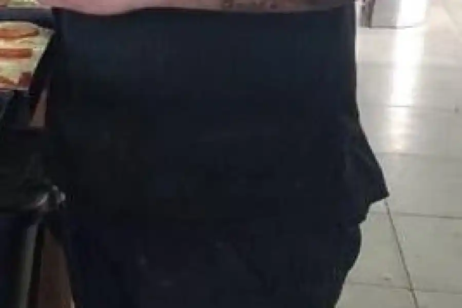 Al momento de ausentarse vestía chomba rayada, bermuda de jeans y zapatillas blancas.