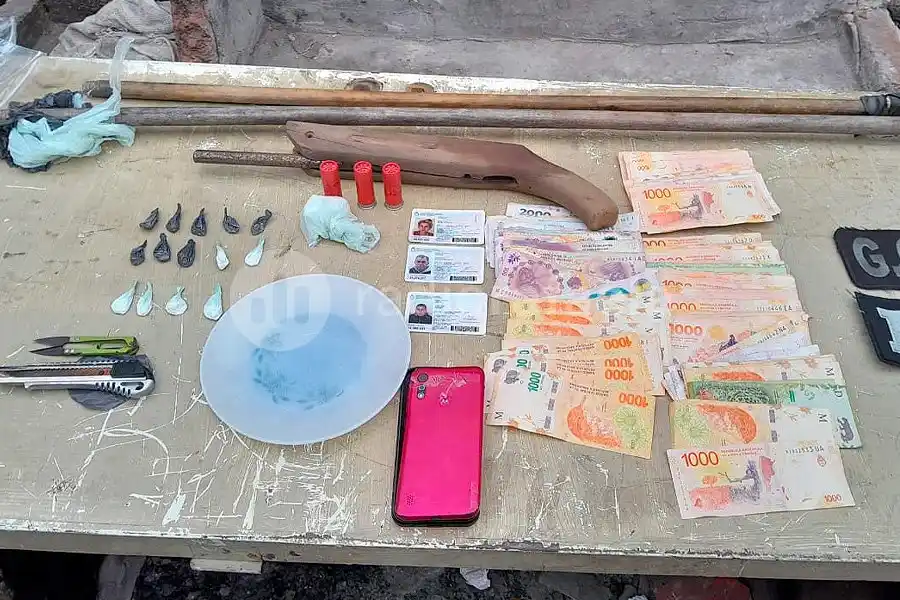 En el procedimiento se logró la detención de las personas mencionadas y el secuestro de 2 teléfonos celulares, 14 envoltorios de nylon con un peso total de 7,6 gramos de cocaína, un trozo compacto de 29,7 gramos de cocaína, la suma de $126.000, elementos de corte y fraccionamiento, un arma de fabricación casera, 2 armas blancas tipo "facas" con mango de madera y 3 cartuchos.