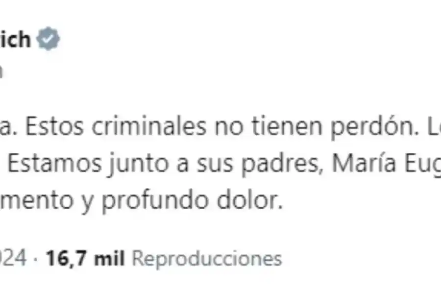 “Asesinaron a Umma. Estos criminales no tienen perdón. Los vamos a buscar hasta encontrarlos. Estamos junto a sus padres, María Eugenia y Eduardo, en este terrible momento y profundo dolor”, dijo Bullrich.