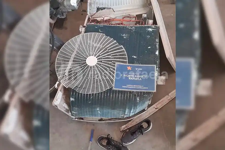 Enseguida fueron hasta el lugar, y se encontraron en un campo cercano con la unidad motora del aire acondicionado todo abollado y en proceso de desarme. Además, cercano a eso encontraron un cuchillo con mango azul y un par de zapatillas.