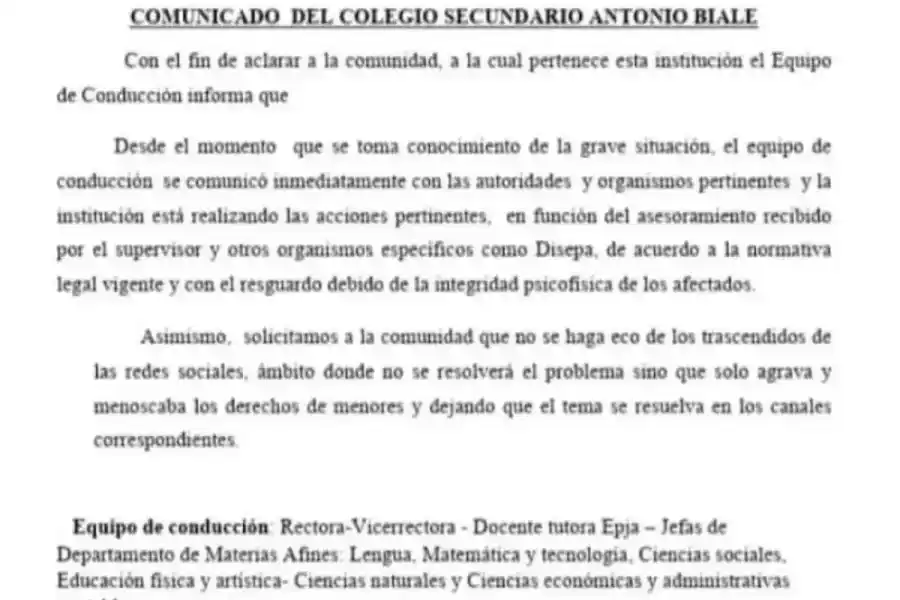 El colegio emitió un comunicado donde aseguró que "la institución está realizando las acciones pertinentes" y solicitó a la comunidad "que no se haga eco de los trascendidos de las redes sociales, ámbito donde no se resolverá el problema, sino que solo agrava y menoscaba los derechos de menores".