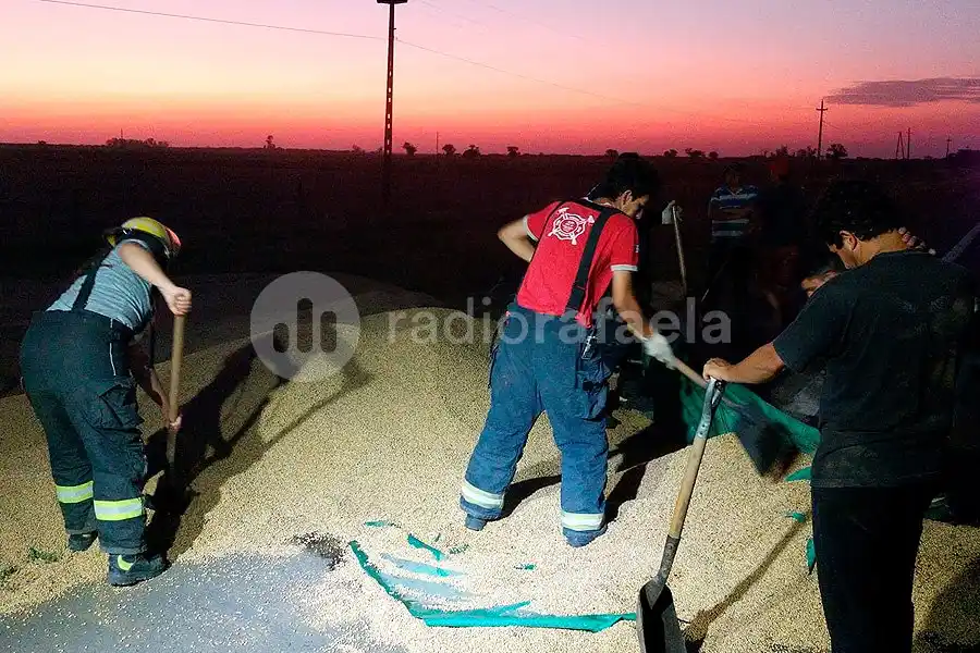 Al arribar al sitio, los Bomberos constataron que no se habían registrado personas lesionadas en el siniestro. Sin embargo, el cargamento de cereal de soja que transportaba el camión se había derramado sobre la calzada, obstruyendo el paso vehicular y generando un potencial riesgo para la seguridad del tránsito.