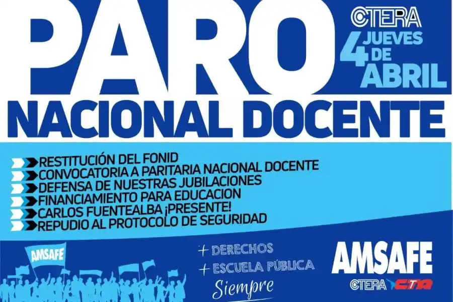 Desde su página web el gremio que nuclea a los docentes santafesinos, AMSAFE, confirmó la adhesión al paro nacional docente, anunciado por CTERA entidad que nuclea a los docentes a nivel nacional.