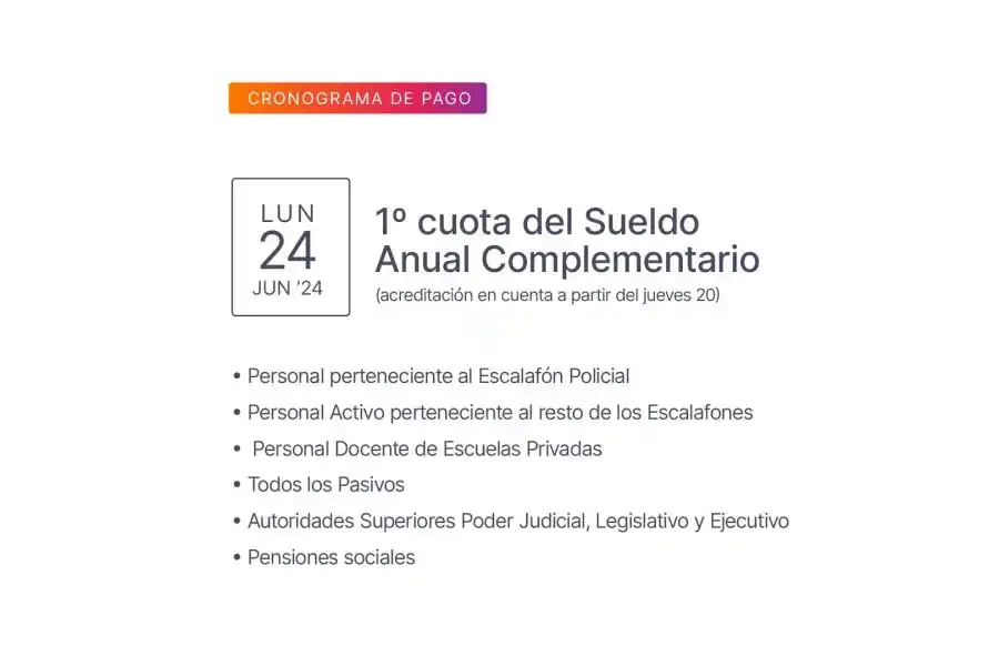El Ministerio de Economía santafesino confirmó el pago de la primera cuota del Sueldo Anual Complementario. Los estatales de la Provincia lo percibirán este lunes 24 de junio, pero desde el jueves 20 ya podrán verlo depositado el aguinaldo en sus cuentas. El pago del aguinaldo incluye el 4% de aumento a percibir con los haberes de junio.