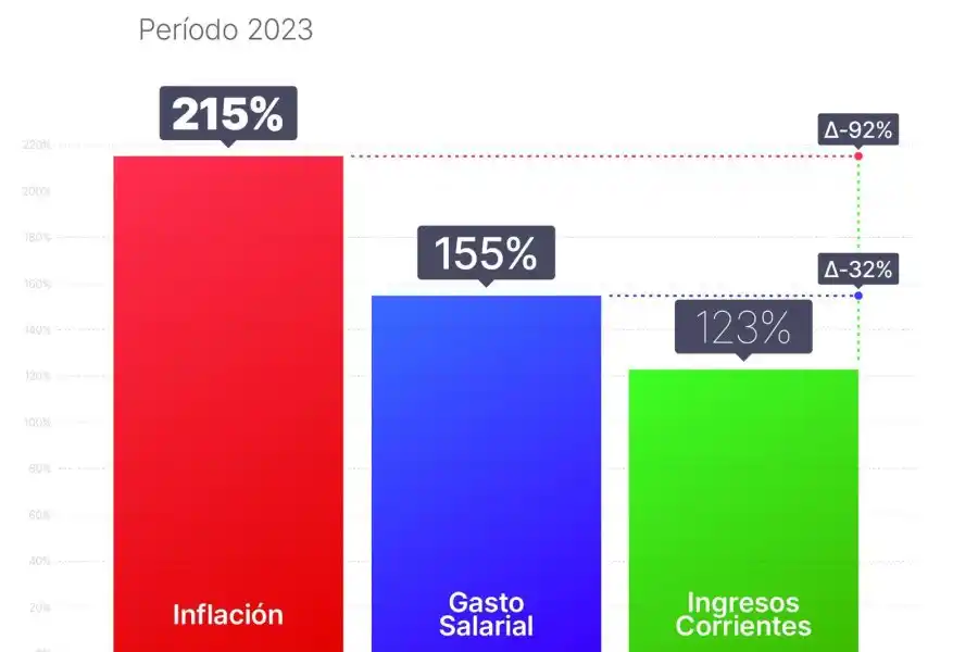 Durante 2023, los ingresos corrientes en la Provincia se ubicaron en el orden del 123 % respecto a 2022, mientras que la inflación fue del 215, 4 %, y el gasto salarial provincial creció un 155 %. El ministro de Economía, Pablo Olivares, advirtió que “Santa Fe cerró el año con un déficit superior a una masa salarial mensual”.