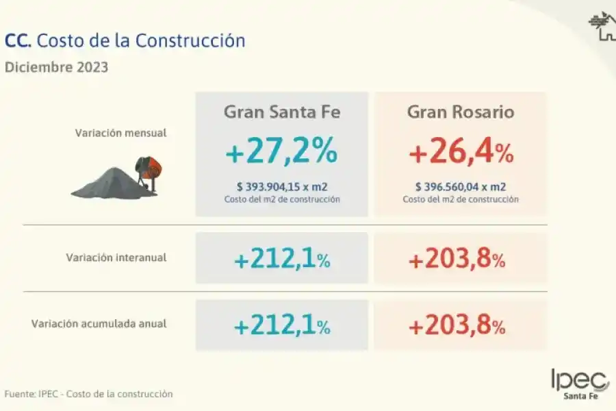 Por su parte, en el aglomerado Gran Rosario, indicó una variación mensual positiva de 26,4%, resultado del alza en los capítulos Materiales 38,3%, Mano de obra 11,0% y Gastos generales 8,6%, totalizando $396.560,04 el m2.