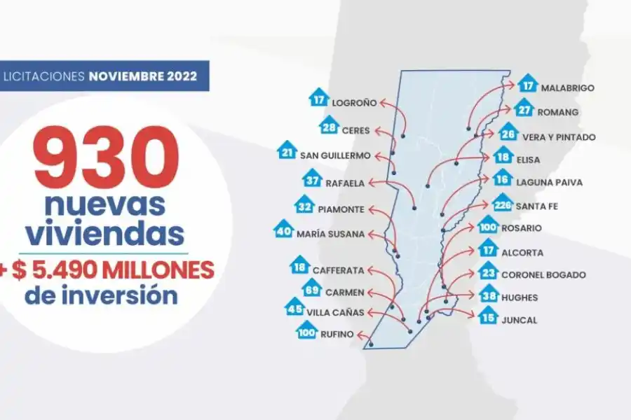 La administración de Omar Perotti, a través del Ministerio de Infraestructura, Servicios Públicos y Hábitat, licitará entre el 7 y el 22 de noviembre la construcción de 930 unidades habitacionales para 20 localidades de la provincia, para lo que se destinará un monto superior a los 5.490 millones de pesos.