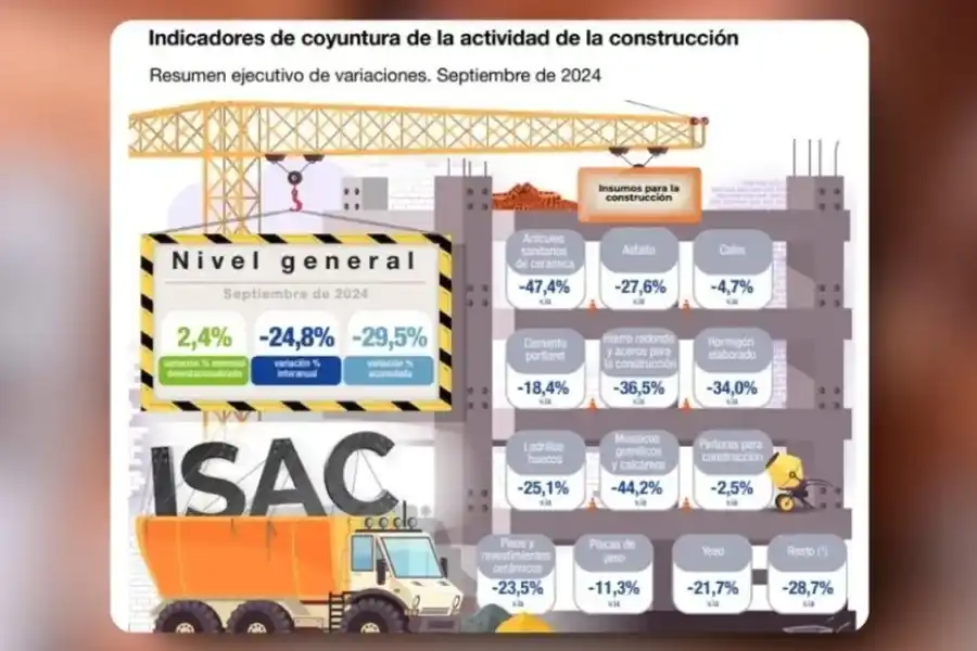 En septiembre de 2024 el Indicador sintético de la actividad de la construcción (ISAC) muestra una baja de 24,8% respecto a igual mes de 2023. El acumulado de los nueve meses de 2024 del índice serie original presenta una disminución de 29,5% respecto a igual período de 2023. Pero el dato saliente del último informe del Indec es que en el noveno mes del año, el índice de la serie desestacionalizada muestra una suba de 2,4% respecto al mes anterior y el índice serie tendencia-ciclo registra una variación positiva de 2,2% respecto al mes anterior.