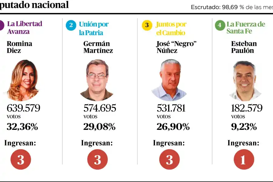 La elección en Santa Fe en la categoría diputados nacionales fue pareja y el reparto de las bancas se dio entre cuatro fuerzas. La provincia ponía en juego 10 lugares, y es la tercera que más escaños renovaba. La sorpresa fue la gran elección de la lista que acompañaba a Juan Schiaretti, ya que al pelotón de La Libertad Avanza 32,36%, Unión por la Patria (29,08%) y Juntos por el Cambio (26,90%), se le coló Hacemos por Nuestro País (9,23%) como minoría.