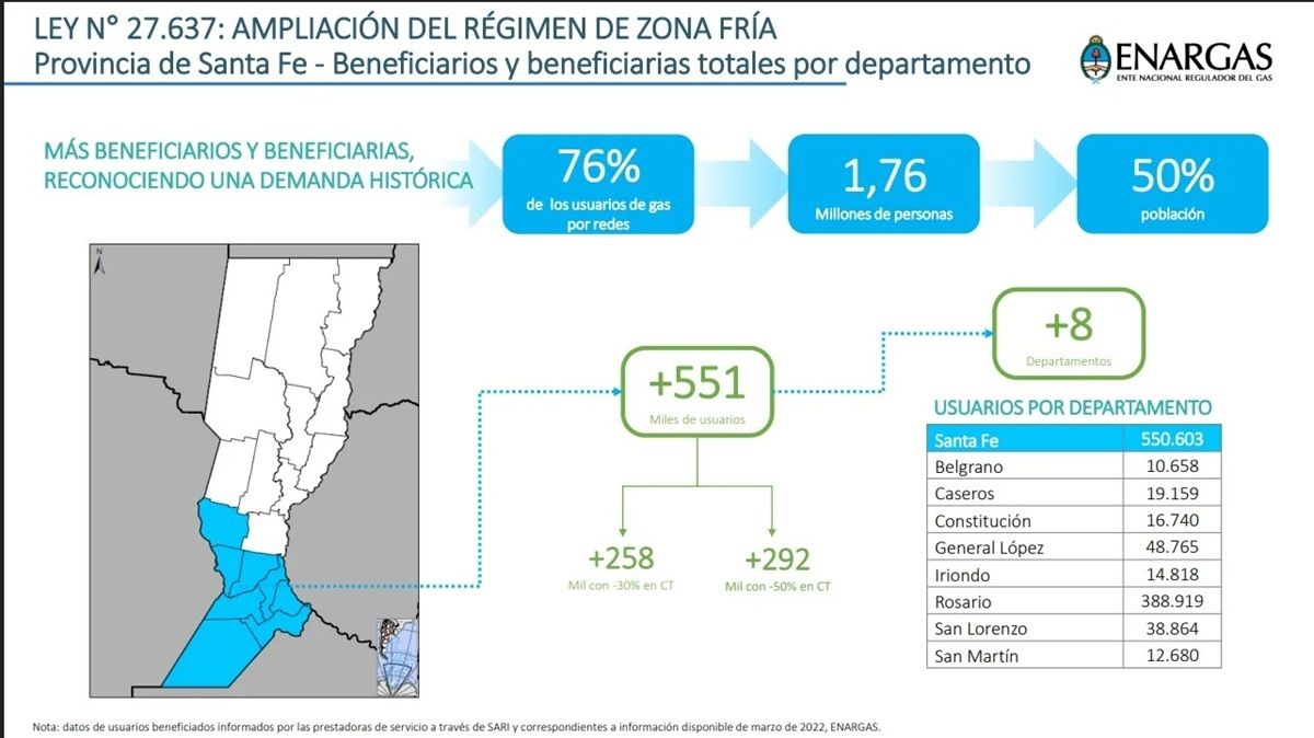 La Ley 27.637/21 amplió el listado de localidades santafesinas alcanzadas por el régimen de Zona Fría, lo que permite a los usuarios residenciales de esas ciudades acceder a descuentos significativos en sus boletas. Con la aplicación de este beneficio, los incrementos mensuales se reducen en más de un 30% respecto del promedio general.
