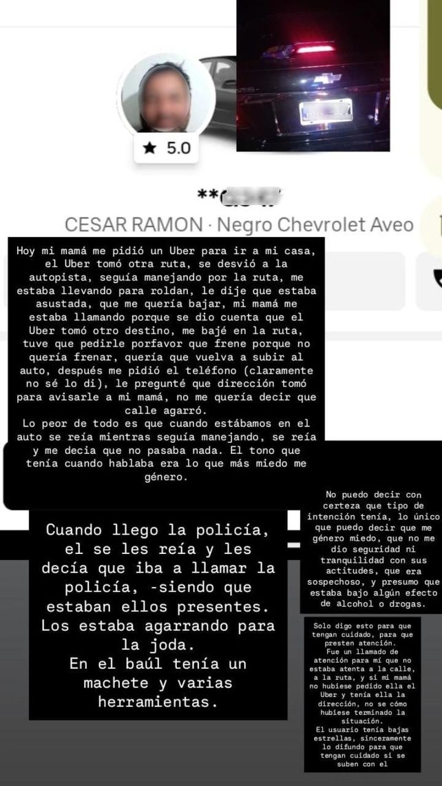 Una joven rosarina vivió momentos de pánico cuando un conductor de Uber tomó un desvío irregular mientras la trasladaba hacia su domicilio. El hecho ocurrió sobre la autopista Rosario-Córdoba, cuando el chofer, a bordo de un Chevrolet Aveo negro, se negó a detenerse a pesar de los reclamos de la pasajera, que llamó a su madre alertando sobre el recorrido.