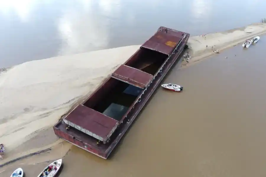 Como vemos en este informe, aquí aparece otra barcaza averiada y abandonada que se sumó a ese paisaje en las últimas semanas. En algún momento la corriente consumirá el arenal y esa mole de toneladas de acero seguirá a la deriva aguas abajo, lo que constituye un peligro que las autoridades deberían atender.