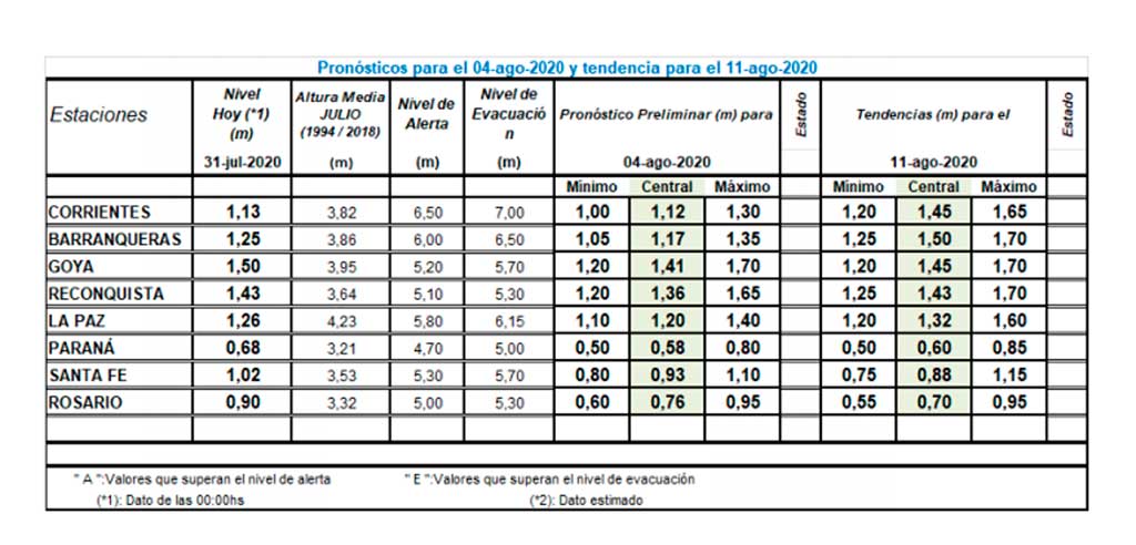Desde el Instituto Nacional del Agua actualizaron este viernes el reporte semanal sobre las proyecciones del nivel del río Paraná en la región. Para el 4 de agosto, estima que podría llegar a los 93 cm; mientras que para el 11 de este mes se espera que siga en descenso y llegue a los 88 cm.