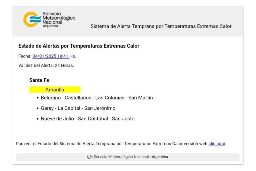 Particularmente, en el territorio santafesino, el aviso del ente nacional afecta a los departamentos de Belgrano, Castellanos, Las Colonias, San Martín, Garay, La Capital, San Jerónimo, 9 de Julio, San Cristóbal y San Justo.