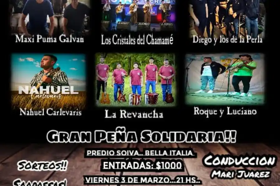 Este viernes, desde las 21:00 hs, se llevará a cabo una gran peña solidaria, en el predio de SOIVA en Bella Italia. Habrá buena música, sorteos y muchas sorpresas.