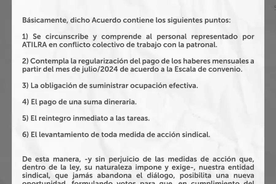 En un comunicado que lleva la firma del titular de ATILRA, Héctor Ponce, el dirigente informó que se entregó una copia del acuerdo a los trabajadores, marcando un avance significativo en la resolución del conflicto.