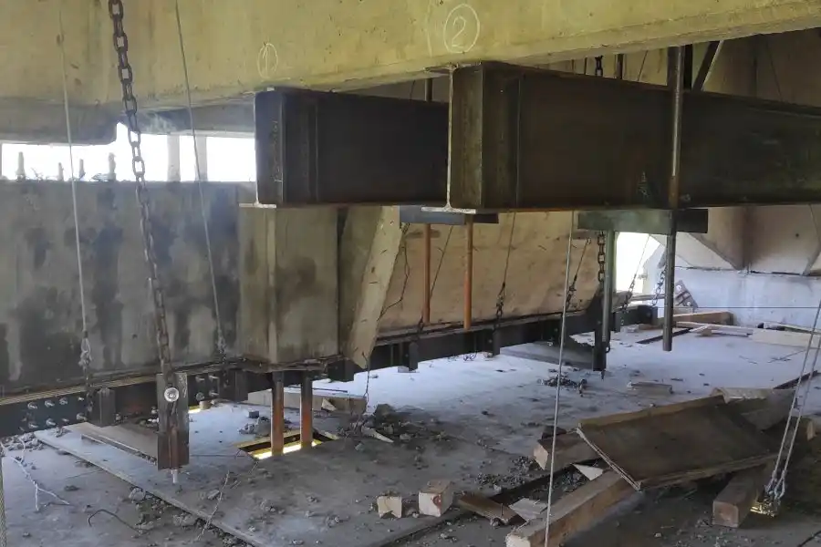 Cabe recordar que en el extremo de las ménsulas se dejó un espacio para la colocación de los gatos hidráulicos con los que se levantará el tablero Gerber para restituirlo a su posición normal. El izado de la estructura representa un procedimiento de alta complejidad, con medidas de seguridad y un proceso calculado adaptado a las dimensiones y pesos del tramo a elevar, entre las cuales figuran seis soportes metálicos adicionales de seguridad instalados para la maniobra.