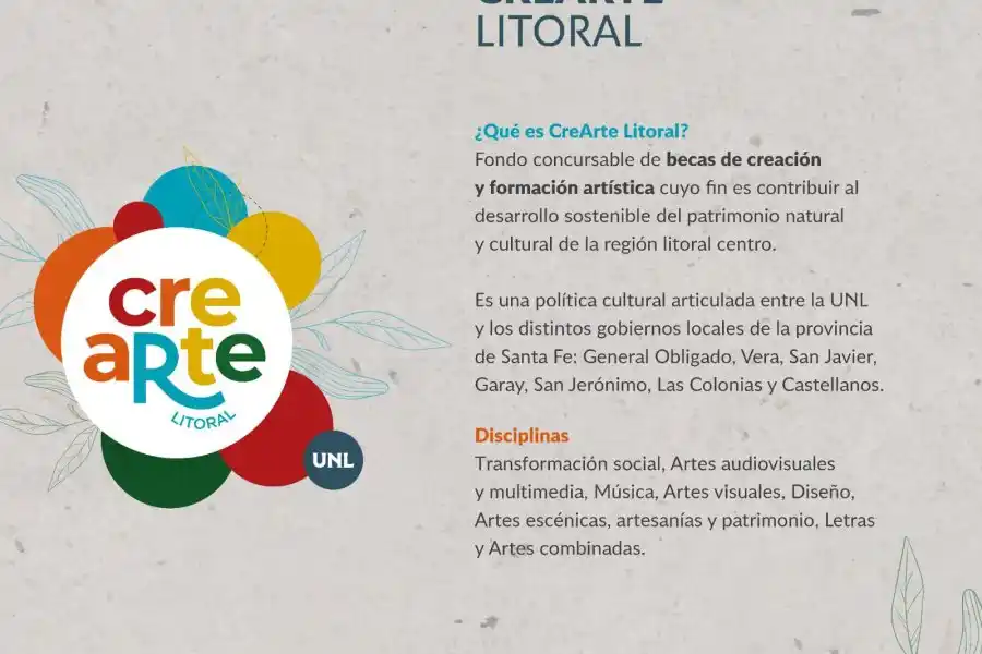 Esta es una iniciativa de la UNL junto a los Gobiernos Locales de los Departamentos General Obligado, Vera, San Javier, Garay, San Jerónimo, Las Colonias y Castellanos en el marco del programa regional de promoción de las artes para la transformación social del litoral, creando el fondo concursable de becas de creación y formación artística CreArte Litoral 2023 con el fin de contribuir al desarrollo sostenible del patrimonio natural y cultural de la región Litoral centro.