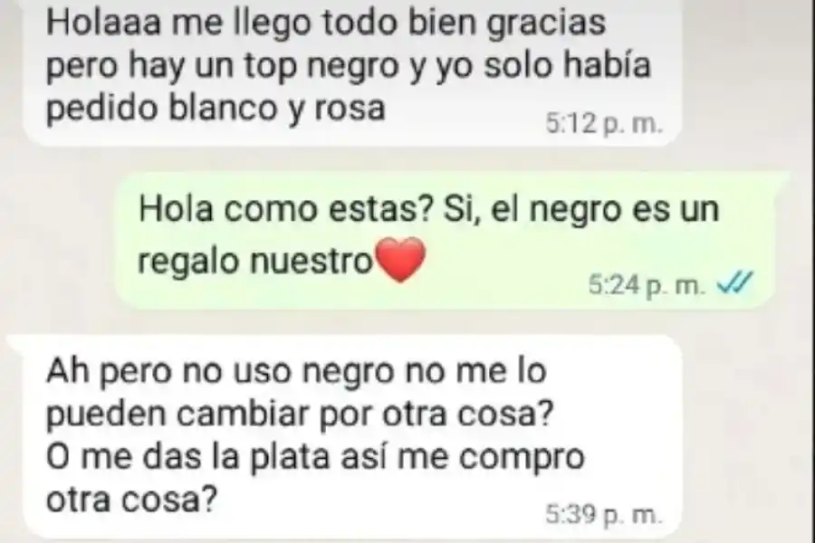 La respuesta de la propietaria de la marca fue clara al decir que se trataba de un regalo, estrategia que algunos comerciantes utilizan para generar buena publicidad. Sin embargo, del otro lado no hubo buen recibimiento, dado que la osada compradora arremetió ‘’No uso negro, ¿Me lo pueden cambiar por otra cosa?’’, e incluso agregó que en ultima instancia le devuelvan el dinero.
