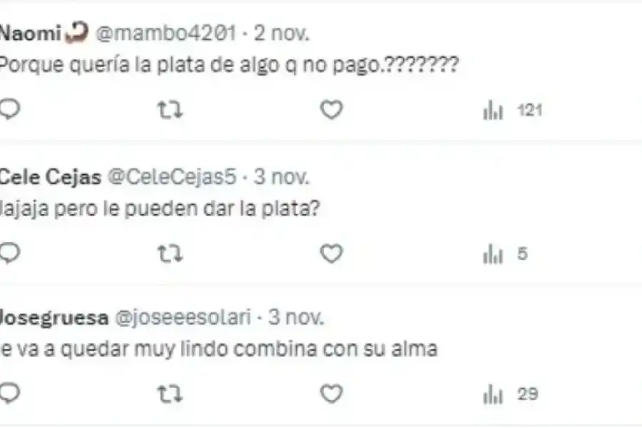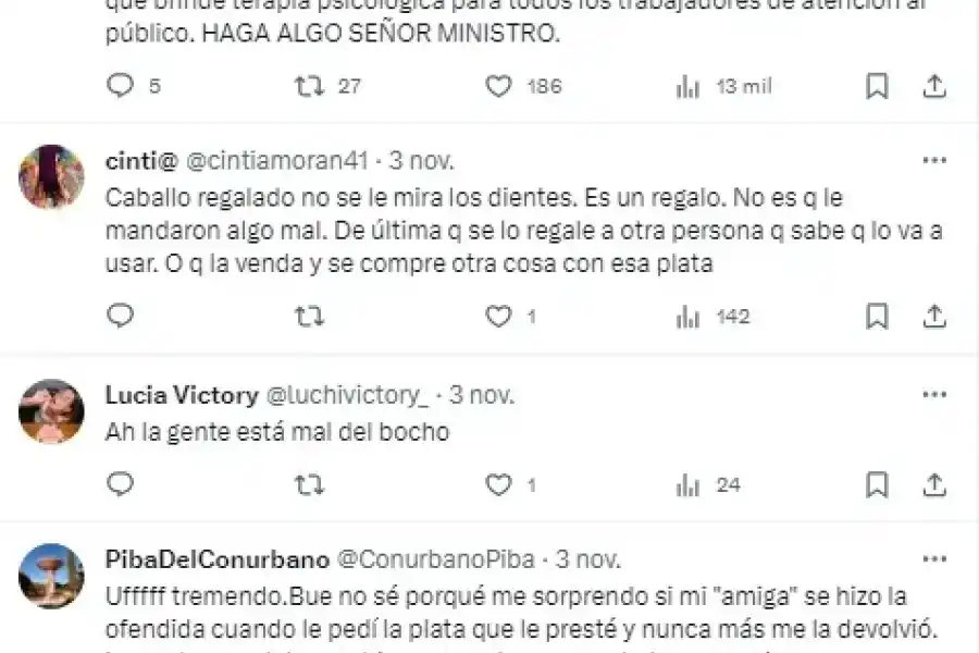 La comunidad de X no tardó en manifestar su descontento, y finalmente, dieron inicio a los ataques. Los primeros comentarios ya denotan la bronca que les generó leer los mensajes, y algunos hasta recordaron sus propias experiencias como emprendedores de venta.Entre las primeras reacciones se destacan ''Qué indignación'', ''Yo creo que termino presa'', '''Más maleducada no se consigue'', ''Es un montón, la gente se pasa...''. Además, una internauta preocupada cuestionó, ''¿No usa negro? que clase de ser oscuro es?''.