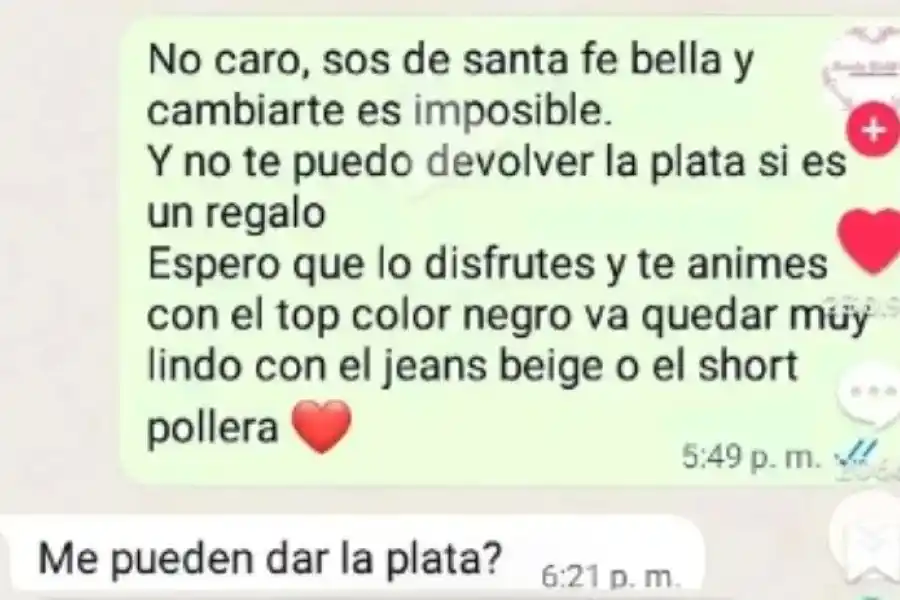 En este punto, la responsable del obsequio comenzó a evidenciar su leve irritación, la que logró manejar como una ‘’campeona’’: ‘’Sos de Santa Fé bella, cambiarte es imposible. Y no te puedo devolver la plata si es un regalo’’, disparó confirmando lo que todos sabemos sobre lo que implica un presente. Y cerro con un gesto de ánimo a la quejosa chica, ‘’espero que lo disfrutes y te animes con el top color negro, ¡Te va a quedar muy lindo!’’.