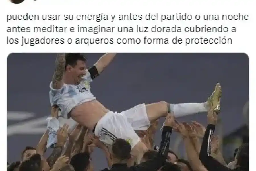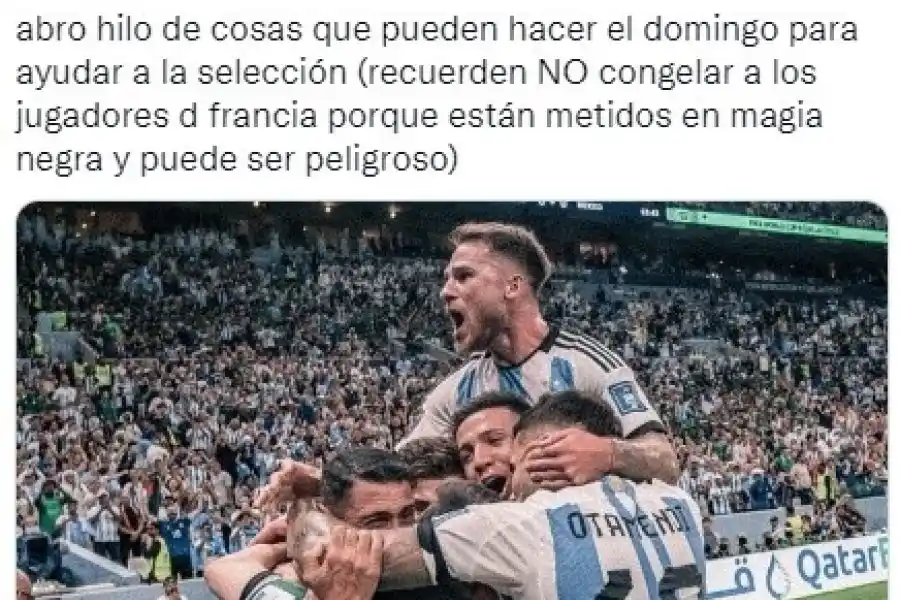 En este sentido, surgió un particular hilo con recomendaciones de rituales y “hechizos” que sí se pueden hacer para ayudar a la Selección Argentina este domingo: “Recuerden NO congelar a los jugadores de Francia porque están metidos en magia negra y puede ser peligroso”, enfatizó Luna, la joven a cargo de la cuenta @folkbecerra.