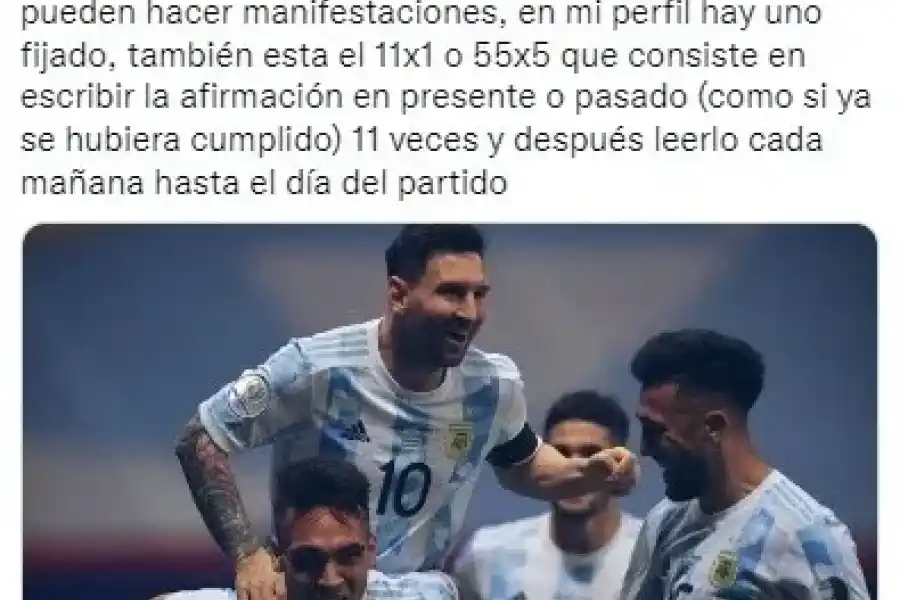 Por último, la cuenta sugirió hacer manifestaciones, como por ejemplo el llamado 11x1, que consiste en escribir la afirmación en presente o pasado 11 veces y después leerlo cada mañana hasta el día del partido.