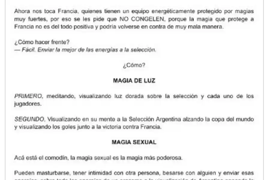 En ese sentido, la recomendación es "masturbarse, tener intimidad con otra persona, besarse con alguien y enviar esas energías", comienza el apartado de un comunicado. Y continúa detallando: "Sobre todo las energías de un orgasmo a la visualización de Argentina ganando la Copa".
