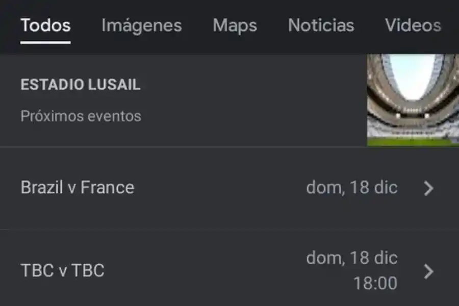 Al buscar “Lusail Stadium próximos eventos”, el escenario de la definición, apareció que el 18 de diciembre se enfrentarán Francia y Brasil. Aunque ya corrigieron el error, se desconoce por qué figuraba así.